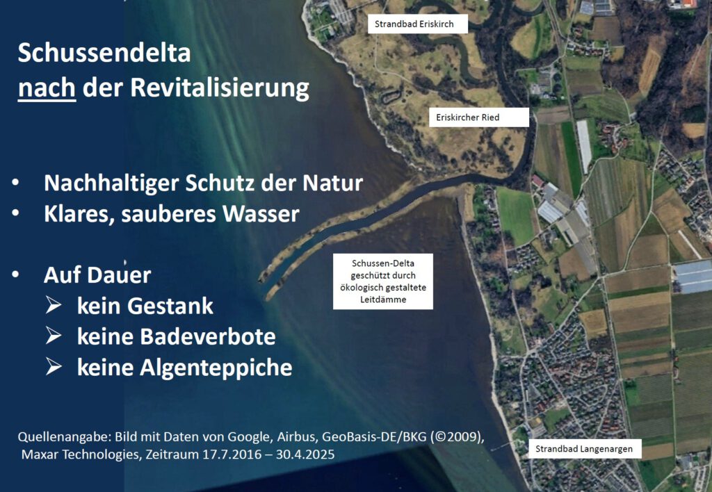 Die Analogie zur Situation an den Mündung der Schussen bei Langenargen ist offensichtlich: Nur mittels Leitdämmen ist es möglich, das hoch mit Nährstoffen belastete und häufig fäkal verunreinigte Wasser der Schussen dauerhaft von den Uferbereichen links und rechts der Mündung fernzuhalten. Profitieren würde auch das Naturschutzgebiet „Eriskircher Ried“ und seine vorgelagerte Flachwasserzone.